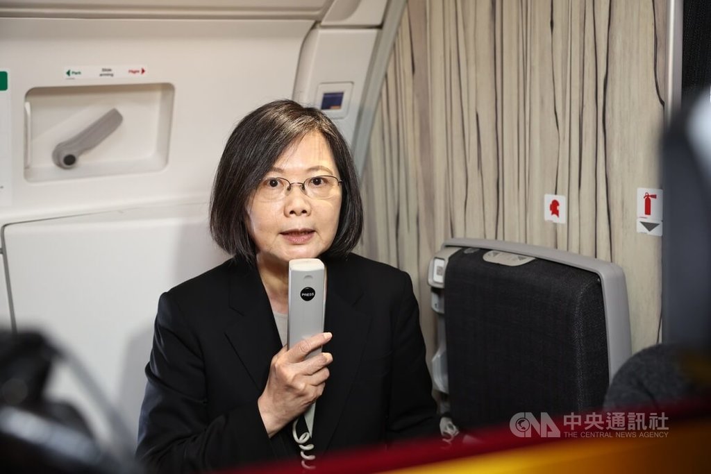 蔡英文也在机上发表简短谈话表示,此行回应友邦诚挚邀请并且深化与民主伙伴的合作交流,出访将前往危地马拉与贝里斯两国,途中过境美国纽约与洛杉矶;飞机降落后将展开一连串紧凑的行程。