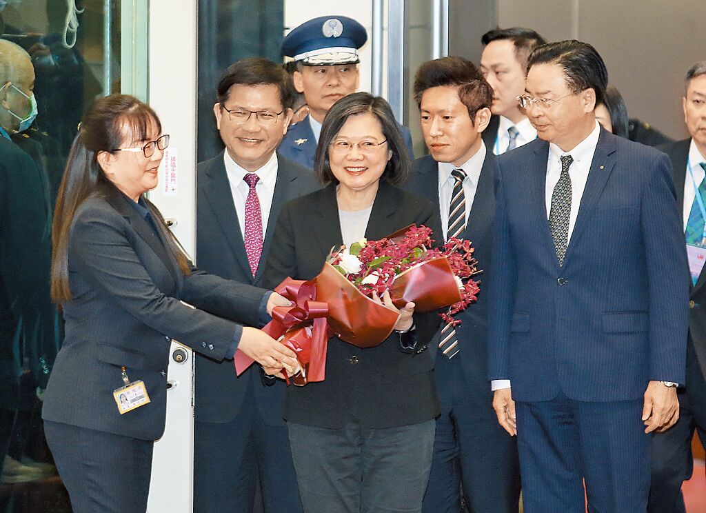 蔡英文说,这趟为期十天的访问,造访友邦瓜地马拉和贝里斯,过境美国纽约、洛杉矶,她感谢每一位伙伴和华航机组成员,大家共同完成这次任务,也感谢海外侨胞、驻外馆伙伴;另外也感谢行政团队跟国安团队维持政务运作,顾好家园让她可以拼外交。
