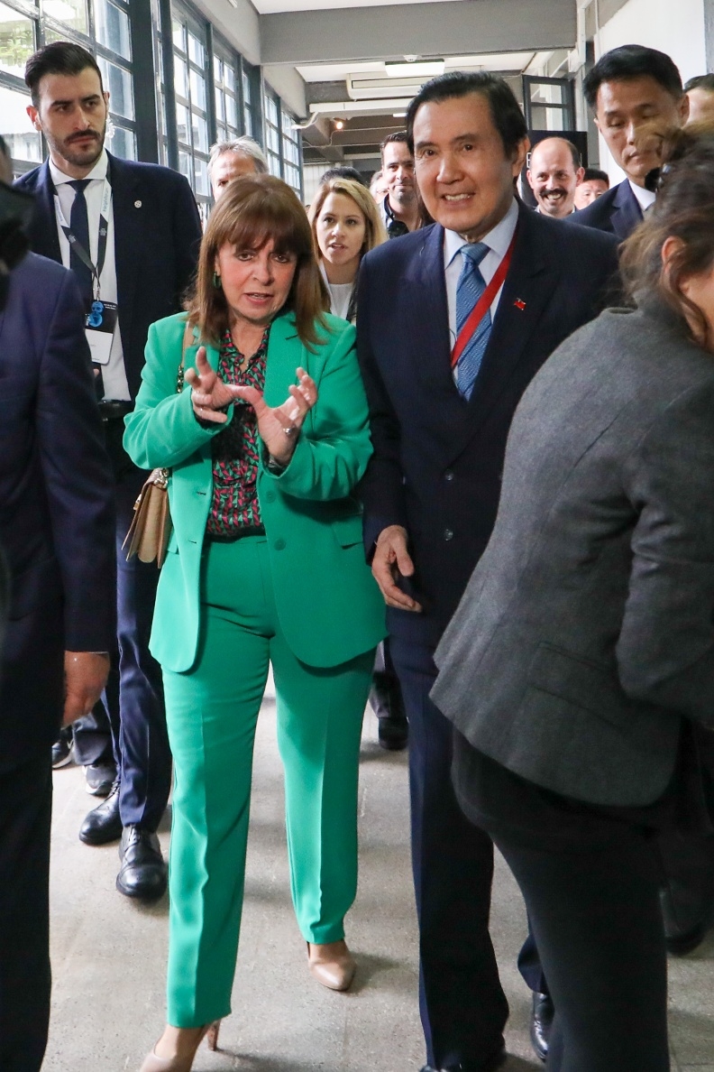周五论坛上,马英九特别向希腊总统卡特琳娜.萨克拉洛普鲁(Katerina Sakellaropoulou)以及论坛创办人兼主席索莫科斯表达感谢之意,而他的称谓,也调整为“中华民国前总统”。