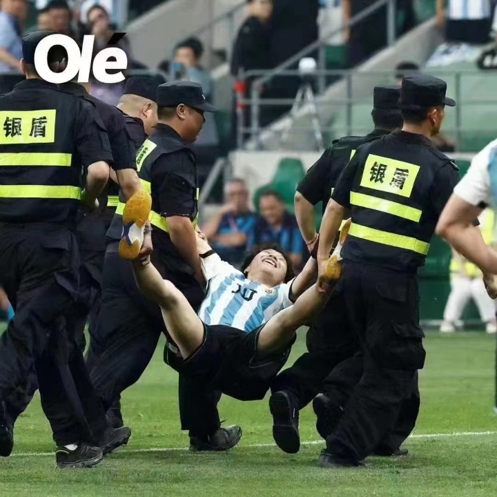 比赛中上演了一幕插曲,一名身穿阿根廷队服的中国球迷冲入球场,拥抱了梅西,并狂奔大半场且与球员击掌,最终被匆忙赶来的多名保安抬出了球场。现场看台引起一波小高潮,观众们瞬间沸腾,连赞该球迷太厉害。