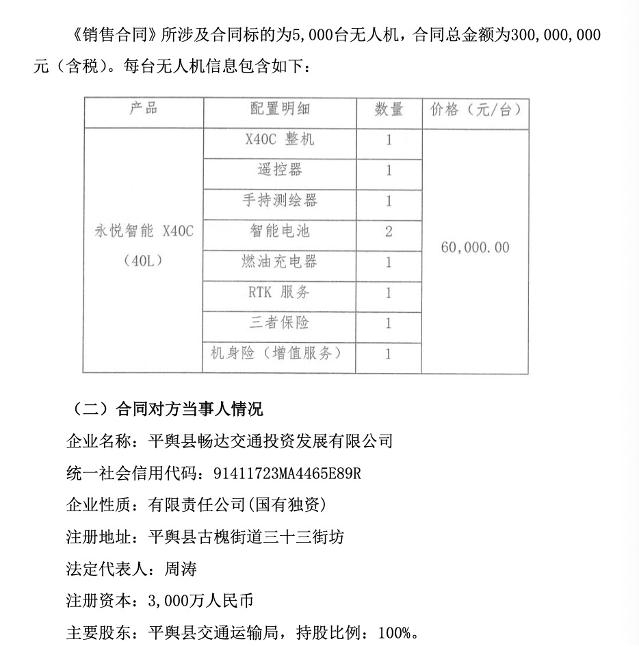 此前,永悦科技曾发布《关于签订重大合同的公告》。公告显示,永悦智能和平舆畅达签订《销售合同》,合同总金额为3亿元,合同所涉及合同标的为5000台无人机。