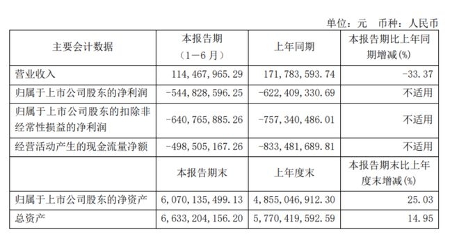 寒武纪昨日晚间披露2023年半年度报告,公司2023年上半年营业收入为1.14亿元,同比下降33.37%;归属于上市公司股东的净利润为-5.45亿元,上年同期为-6.22亿元;归属于上市公司股东的扣除非经常性损益的净利润为-6.41亿元,上年同期为-7.57亿元;经营活动产生的现金流量净额为-4.99亿元,上年同期为-8.33亿元。