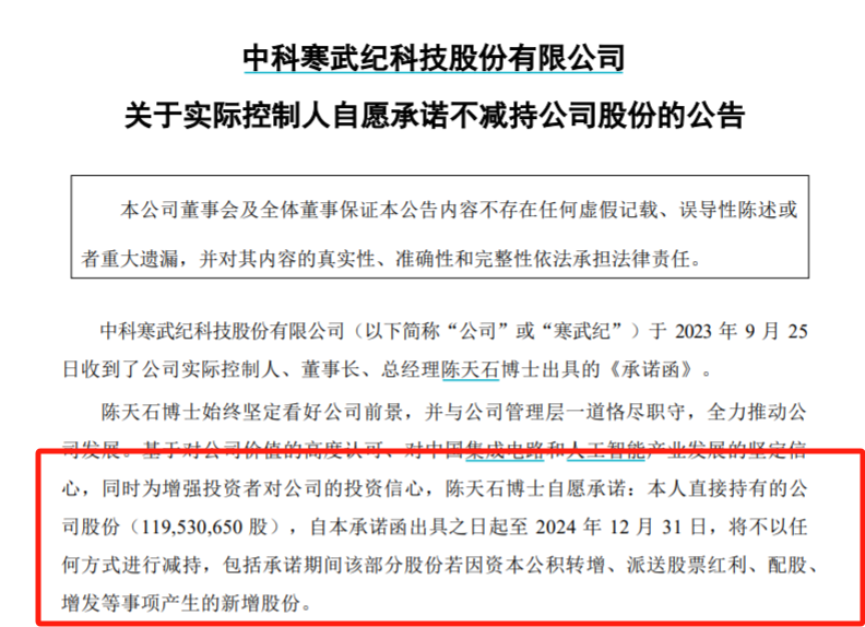【纬度新闻网】9月26日早间,总市值超500亿元的AI芯片龙头寒武纪宣布,公司实际控制人、董事长、总经理陈天石自愿承诺,其直接持有的公司股份1.20亿股股份,自2023年9月25日至2024年12月31日期间将不以任何方式进行减持。消息宣布后,寒武纪早盘股价走高,盘中最大涨幅超6%。