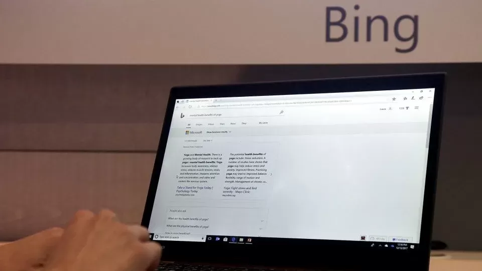 微软高级产品营销经理劳拉·琼斯 (Laura Jones) 在 2017 年 12 月 13 日星期三于旧金山举行的微软活动中演示了 Bing 中的新智能搜索功能。 – Jeff Chiu/美联社