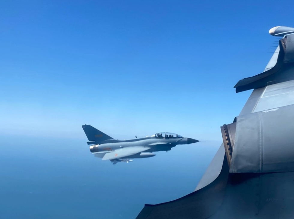 从加拿大军队喷气式飞机的窗户外可以看到远处有一架中国战斗机。 Neetu Garcha/全球新闻
