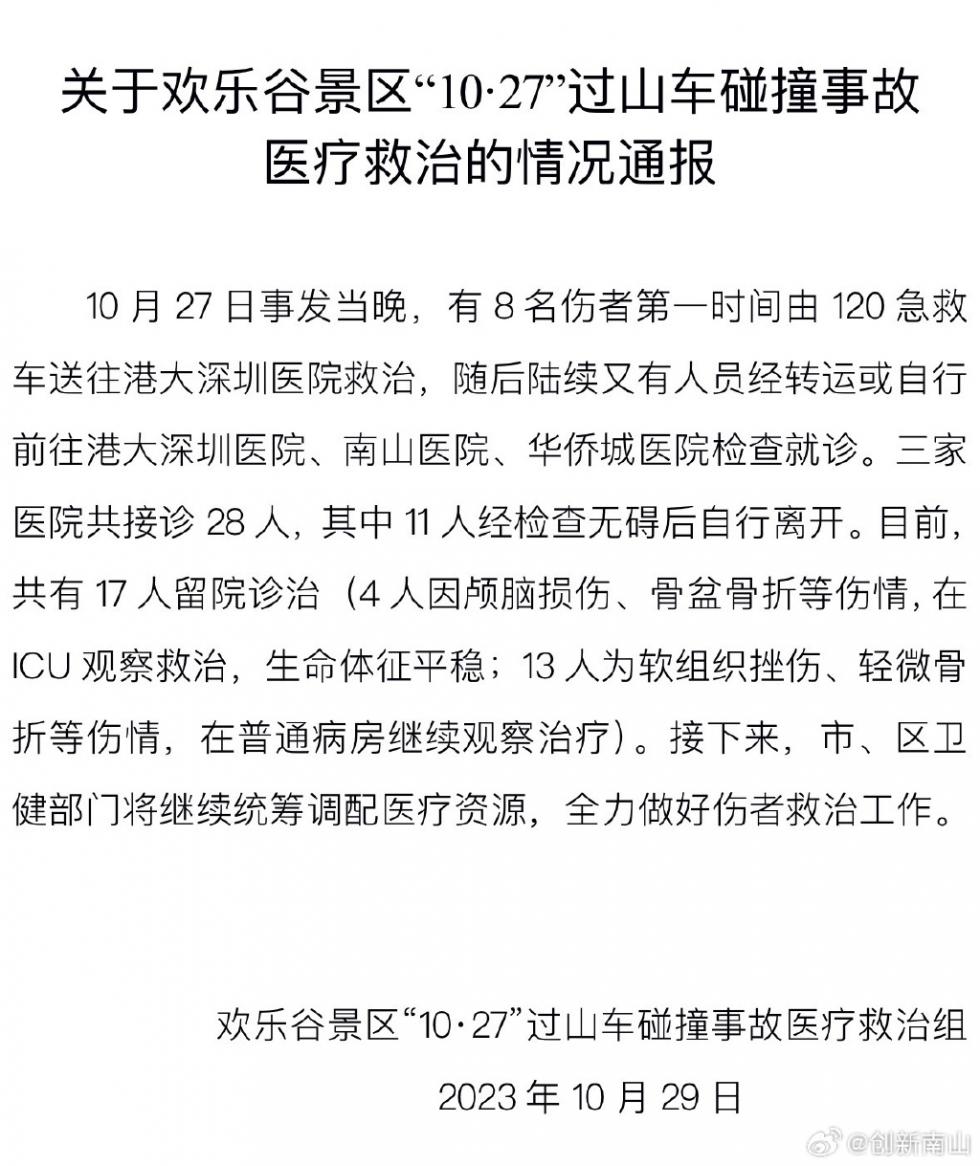 10月29日,深圳市南山区委(区政府)官方微博“创新南山”发布《关于欢乐谷景区“10·27”过山车碰撞事故医疗救治的情况通报》: