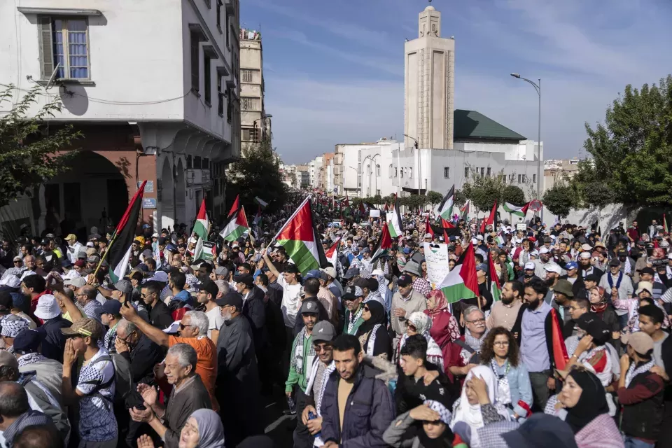 2023 年 10 月 29 日星期日,数千名摩洛哥人在摩洛哥卡萨布兰卡参加抗议活动,声援加沙巴勒斯坦人,反对与以色列关系正常化。美联社