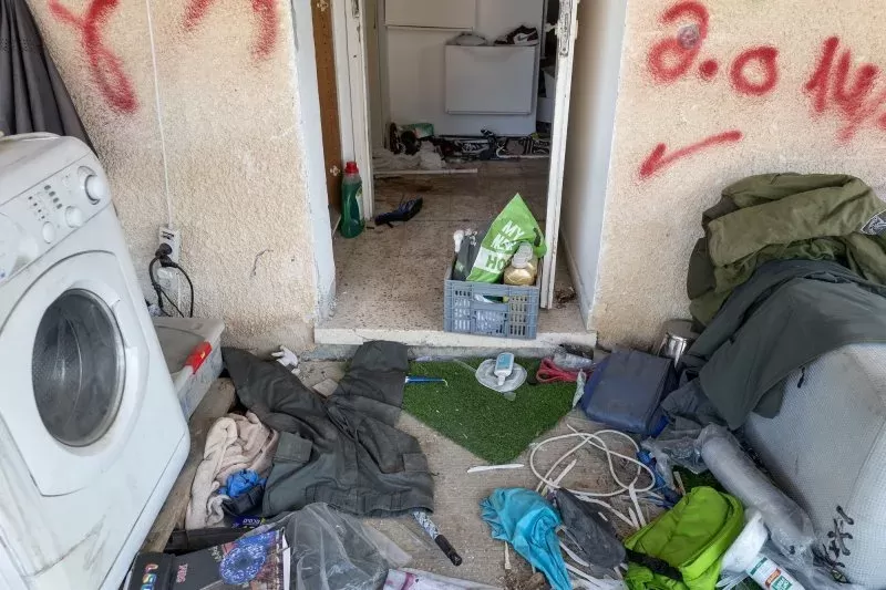 2023 年 11 月 5 日星期日,卡法阿扎 (Kfar Azza) 社区的一处犹太住宅遭到破坏,个人财物遭到破坏。吉姆·霍兰德/UPI 摄