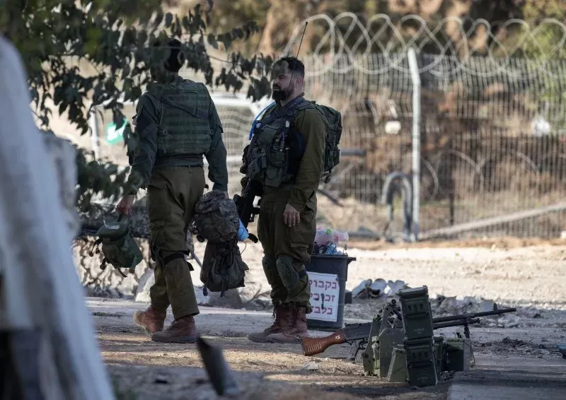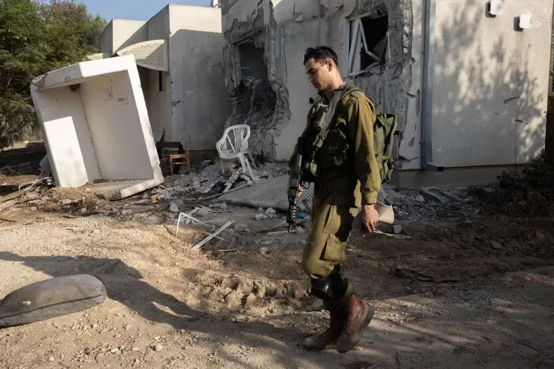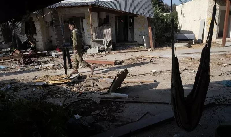 2023 年 11 月 5 日星期日,一名以色列士兵走过卡法阿扎犹太社区一处被毁的犹太住宅。吉姆·霍兰德/UPI 摄