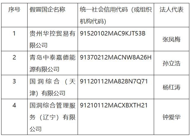 华润集团表示,经核实,贵州华控贸易有限公司、青岛中泰嘉德能源有限公司、国润综合(天津)有限公司、国润综合管理服务(辽宁)有限公司等4家公司及其下设各级子公司均为假冒国企,与华润集团无任何隶属或股权关系,也不存在任何投资、合作、业务等关系,其一切行为均与华润集团无关。