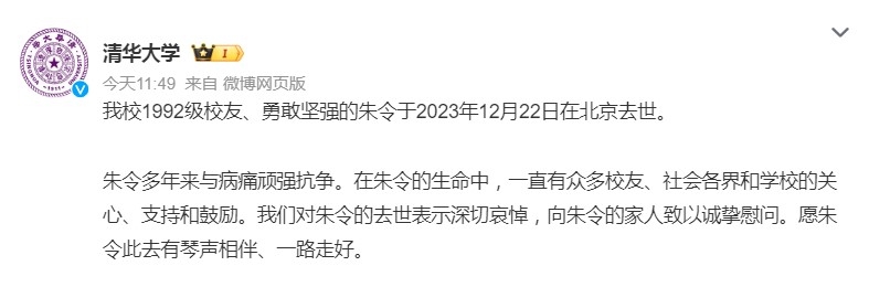 朱令多年来与病痛顽强抗争。在朱令的生命中,一直有众多校友、社会各界和学校的关心、支持和鼓励。我们对朱令的去世表示深切哀悼,向朱令的家人致以诚挚慰问。愿朱令此去有琴声相伴、一路走好。