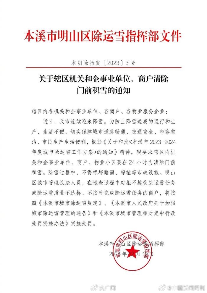 对此,明山区委宣传部一名负责人对央广网表示,商户负责门前责任区的除雪工作实施多年,发通知也是督促沿街商户做好分内的除雪工作,“而且在实际工作中并没有进行处罚”。