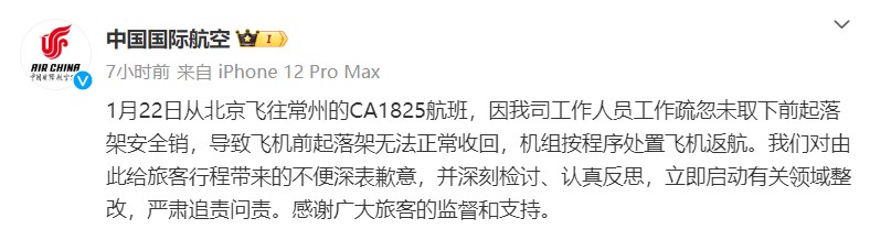 商业 国航工作人员疏忽致飞机起落架无法收回 2024年01月23日 13:54 中国国际航空 据中国国际航空官方微博消息:1月22日从北京飞往常州的CA1825航班,因我司工作人员工作疏忽未取下前起落架安全销,导致飞机前起落架无法正常收回,机组按程序处置飞机返航。我们对由此给旅客行程带来的不便深表歉意,并深刻检讨、认真反思,立即启动有关领域整改,严肃追责问责。感谢广大旅客的监督和支持。 中国国际航空官方微博截图