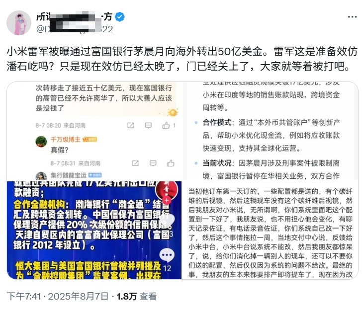 近日,某社交媒体用户称“雷军通过富国银行茅XX向海外转出50亿美金”,小米集团官方周五(8月8日)作出明确回应:该传言为不实信息,公司已取证并启动司法程序,依法追究造谣传谣者责任。