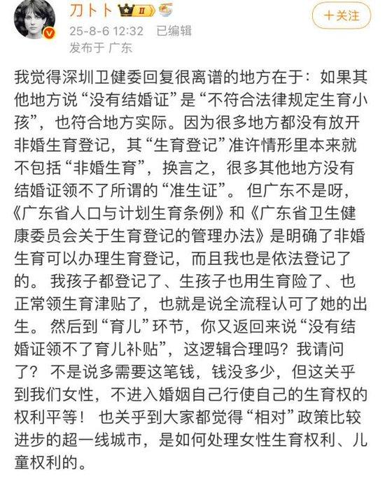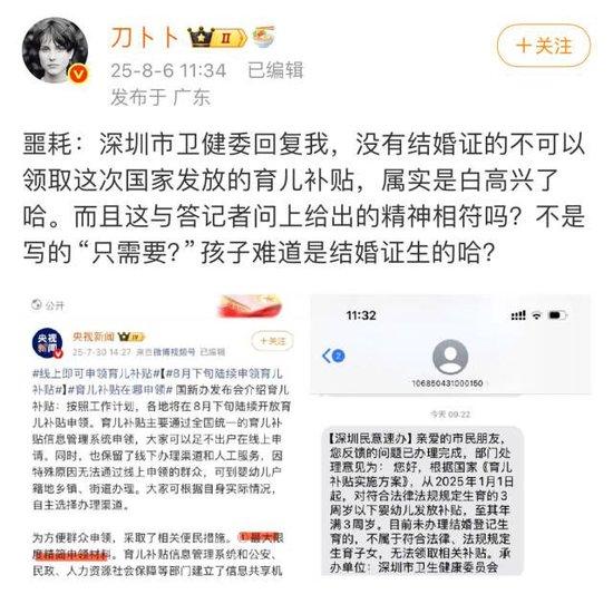 该网友表示,根据《广东省人口与计划生育条例》及《广东省卫生健康委员会关于生育登记的管理办法》,非婚生育也可依法办理生育登记。其孩子已完成出生登记,使用了生育保险并领取了生育津贴,“全流程都认可了孩子的出生”,因此对无法领取育儿补贴的理由感到不解。