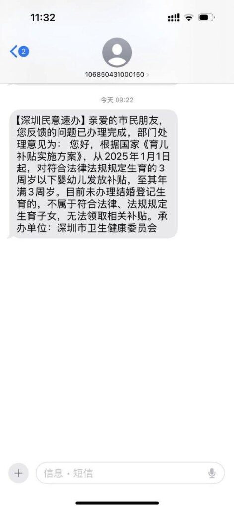 近日,社交平台上有网友发帖称,自己因未办理结婚登记生育子女,被深圳市卫生健康委员会短信告知“不符合法律、法规规定生育”,无法领取相关育儿补贴。该帖一经发布便引发广泛关注和热议。