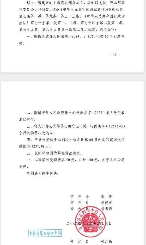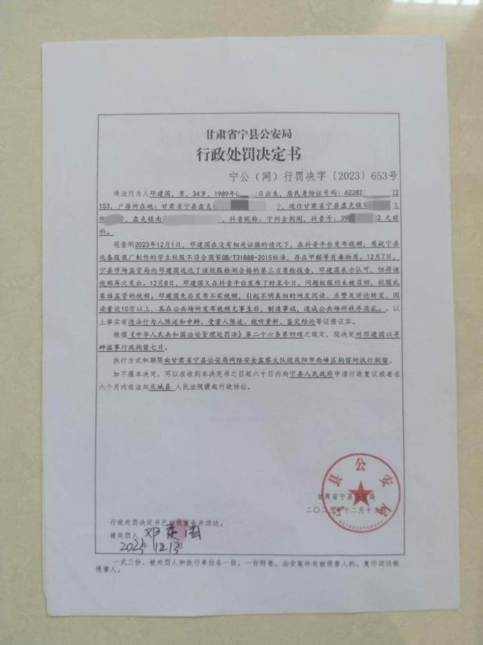 甘肃庆阳市宁县盘克镇居民邓某因在抖音发布视频质疑儿子学校校服质量,被宁县公安局网安大队以“寻衅滋事”行政拘留7日。邓某提起行政诉讼后,庆阳市中级人民法院二审认定该行政处罚程序违法、证据不足,判决确认处罚违法,并判令宁县公安局赔偿3237.08元。