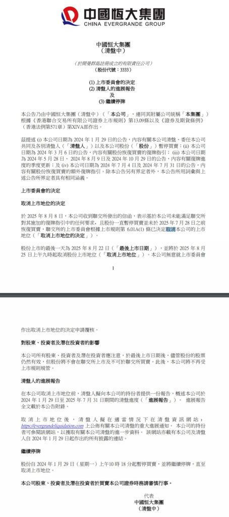 中国恒大周二(8月12日)发布公告,公司将于2025年8月25日取消上市地位。