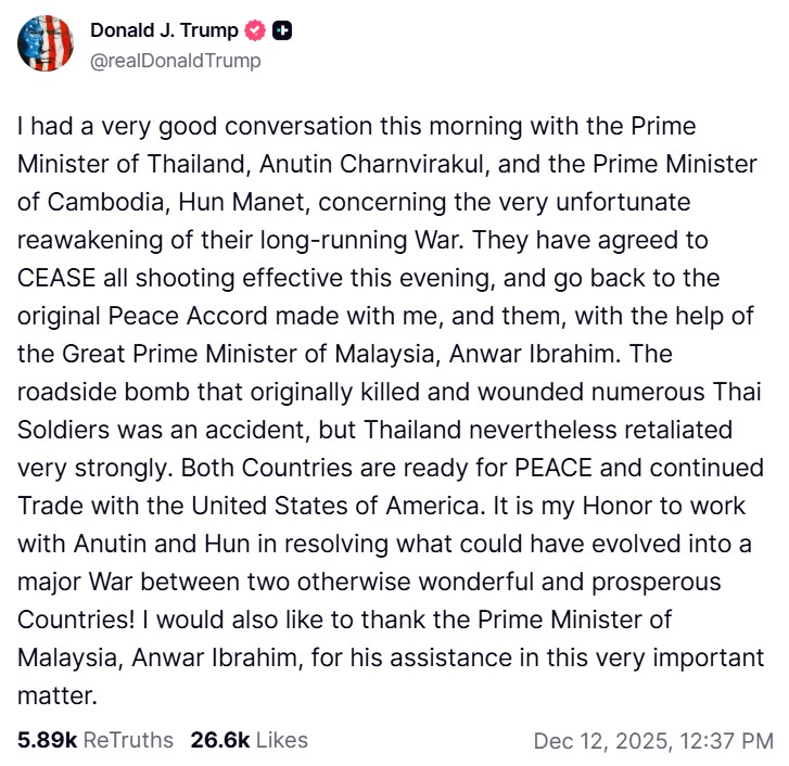 特朗普在“真实社交”平台发文称,与泰国总理阿努廷(Paetongtarn Shinawatra)和柬埔寨首相洪玛奈(Hun Manet)的通话“非常顺利”,两国领导人均承诺立即停止一切交火行动,回归原有和平框架。他同时感谢马来西亚总理安瓦尔在调解中发挥的作用。
