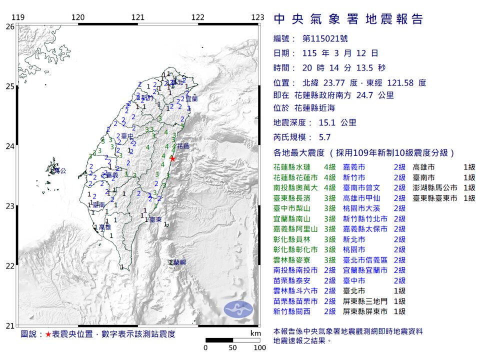 台湾花莲县近海周四(3月12日)晚发生里氏5.7级地震,震源深度约15公里,多地出现明显震感。气象部门表示,此次地震位于欧亚板块与菲律宾海板块交界区域,预计未来3至5天可能出现规模4.5至5级的余震。