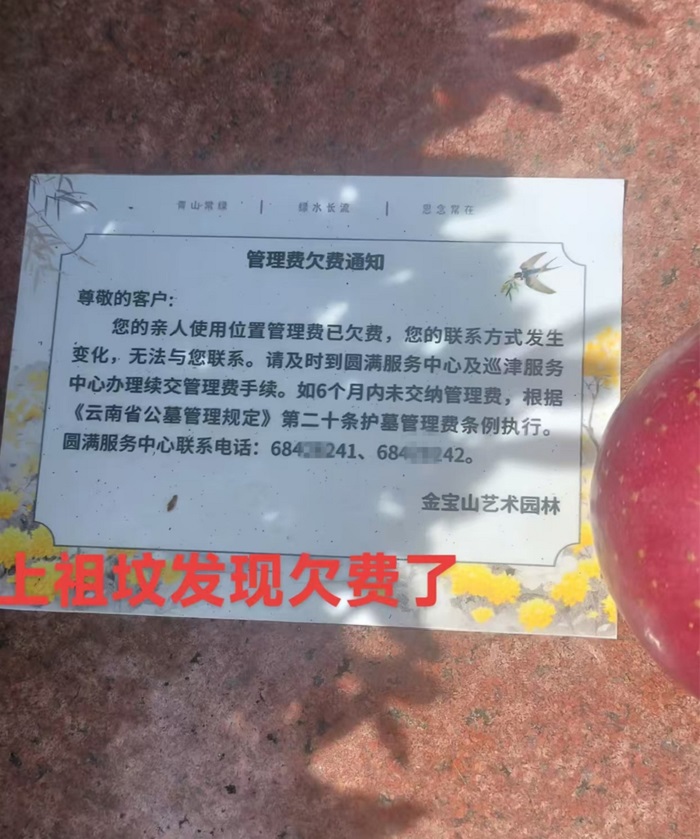 云南昆明一公墓张贴“欠费通知”, 管理方称常规收费管理